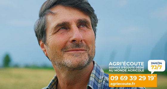 Parce que le mal-être peut toucher tout le monde, Agri’écoute est là pour vous dès les premières difficultés. Des psychologues échangent avec vous à tout moment, en préservant votre anonymat. Agri'écoute est accessible par téléphone au 09 69 39 29 19 (prix d’un appel local) ou par tchat sur agriecoute.fr. On a tous besoin d’être soutenu un jour ou l’autre.